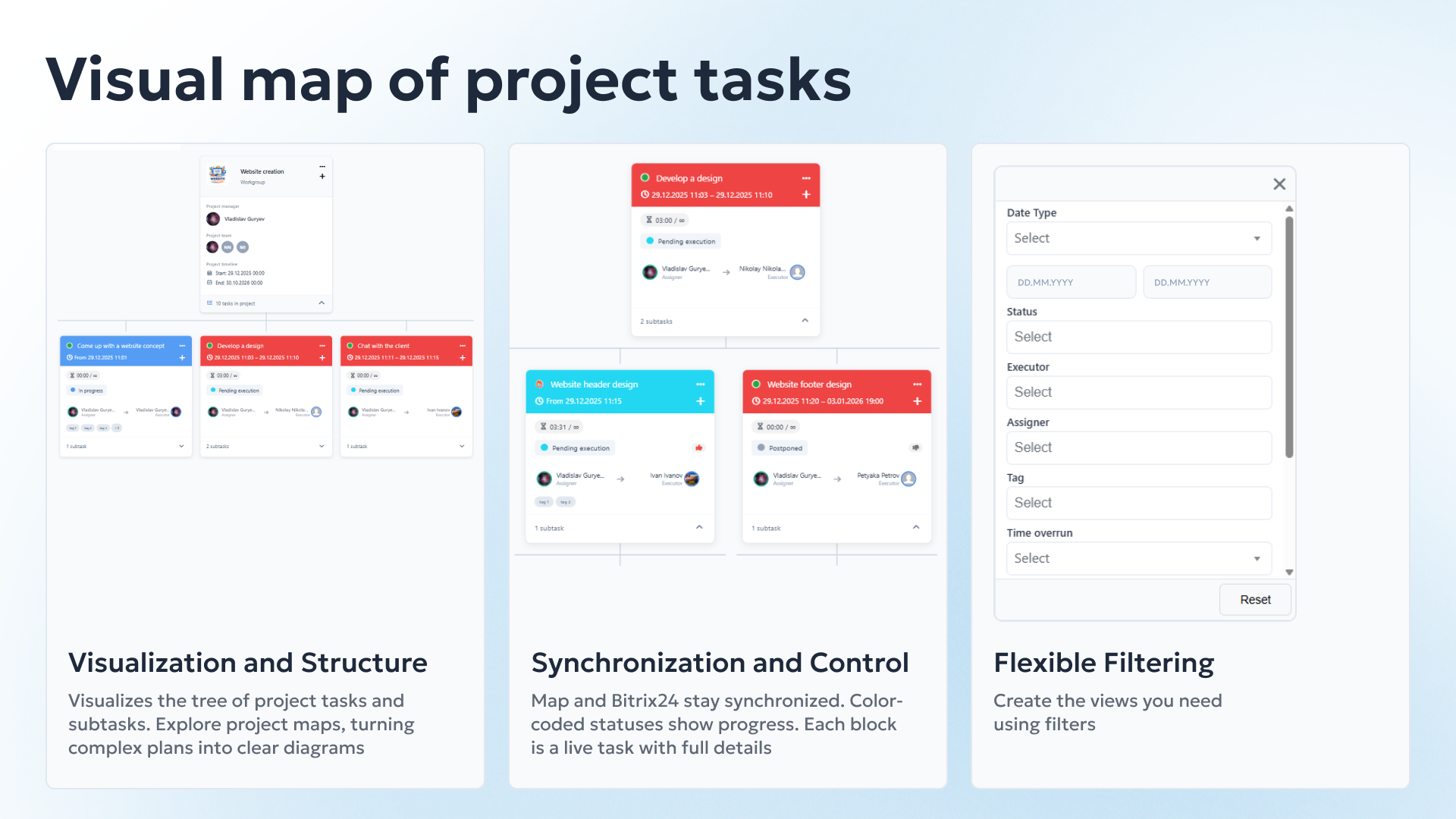 Project task management becomes visual! Our solution integrates with Bitrix24 and transforms complex task lists into interactive maps. View the entire project structure at a glance and manage it visually.