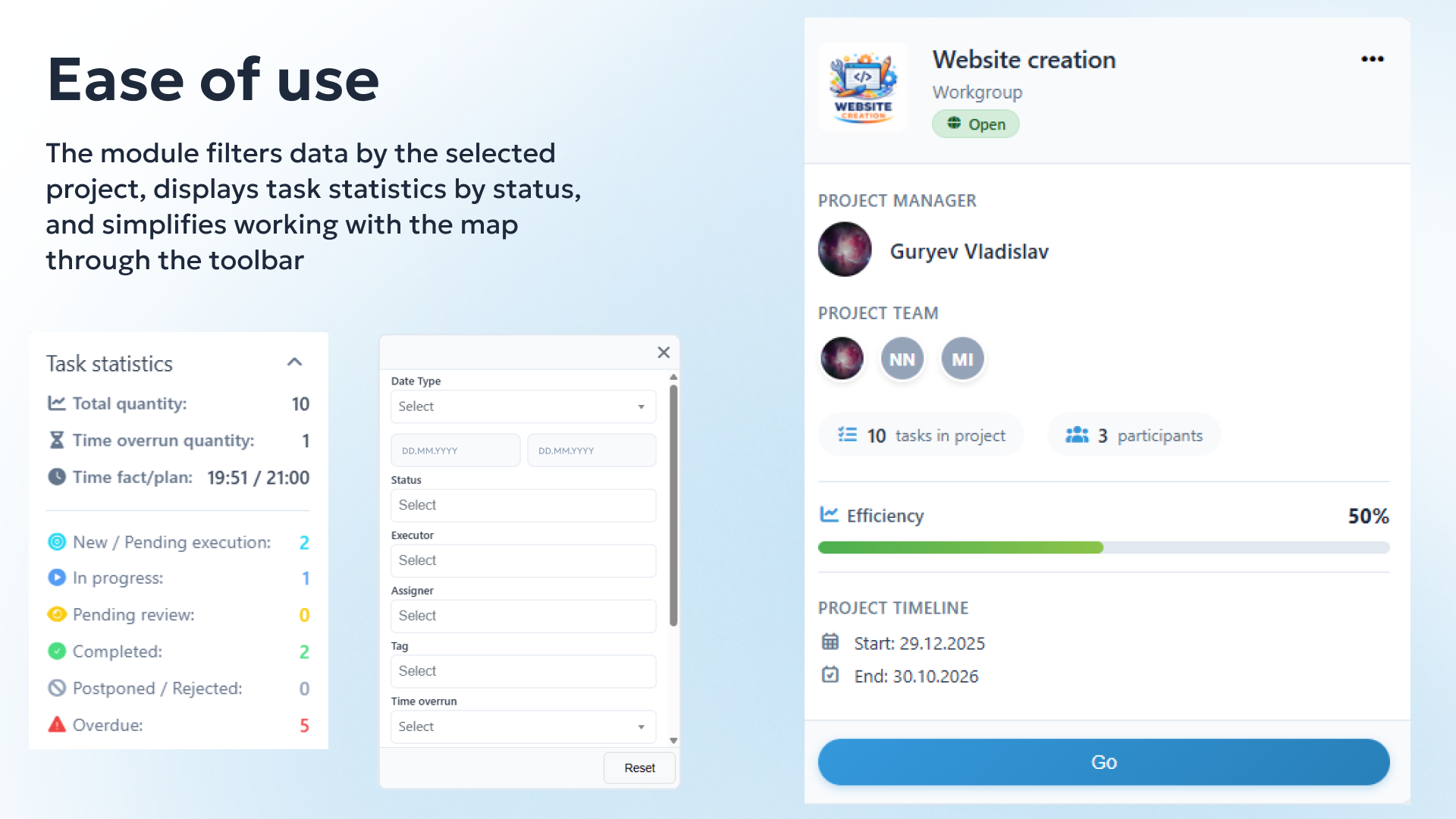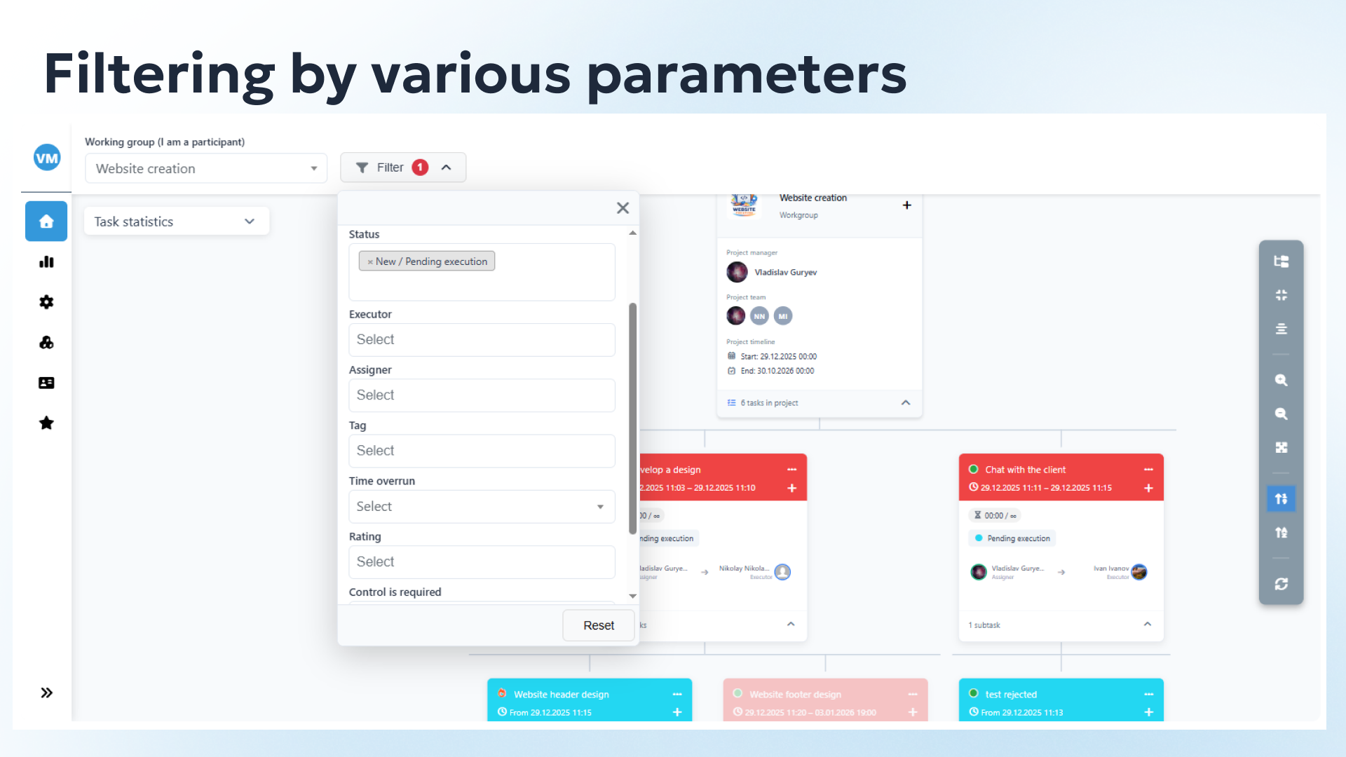 ✅ Powerful filtering system: Create the views you need by filtering the map by project, assignee, status, deadline, or task manager. Hide unnecessary details to focus on what matters.