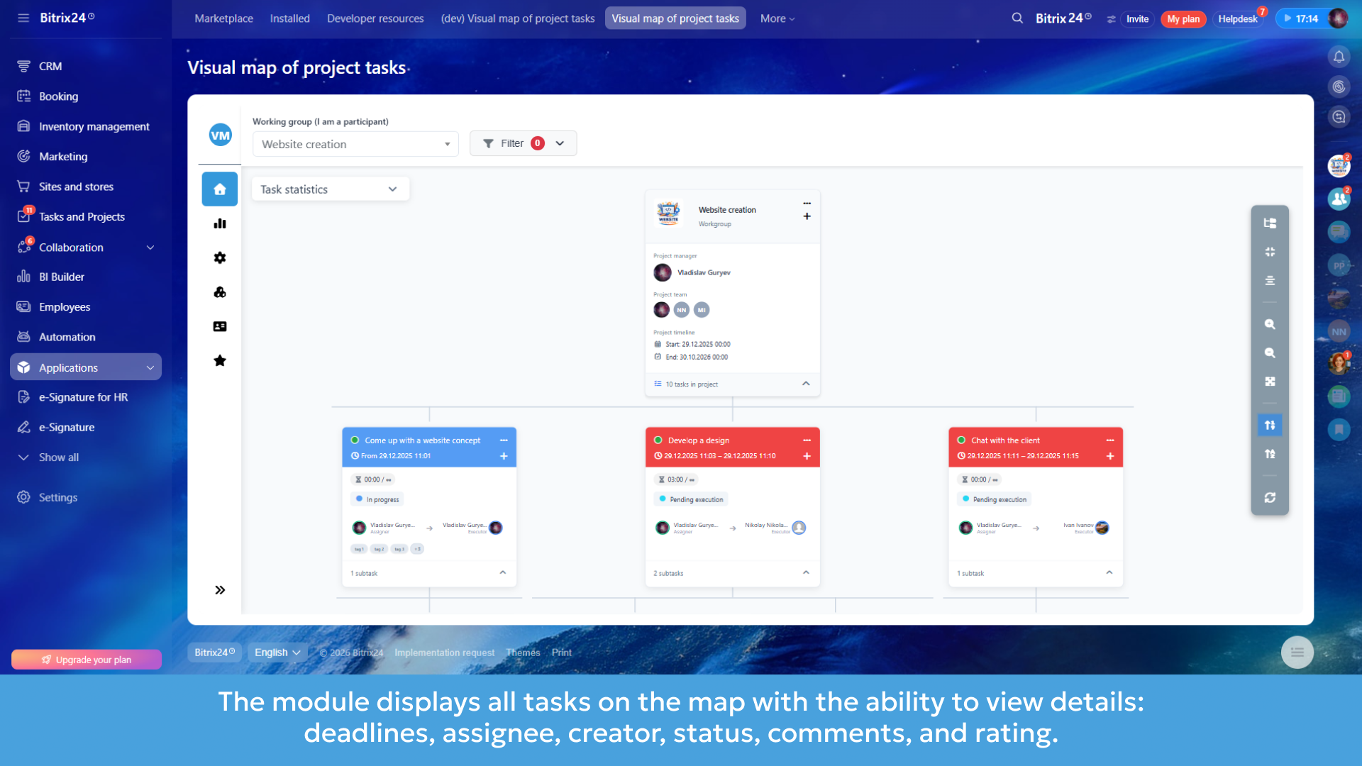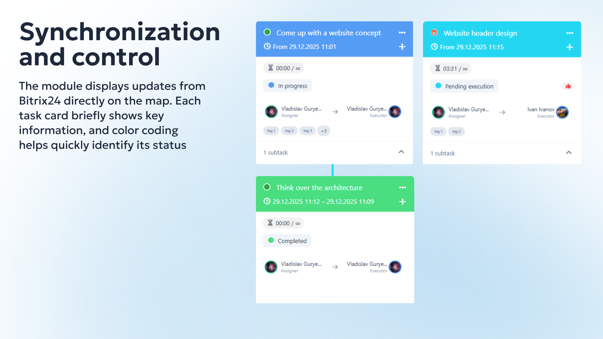 ✅ Two-way synchronization in real time: Any changes to the status, deadlines, or task name on the map are reflected in Bitrix24, and vice versa.
