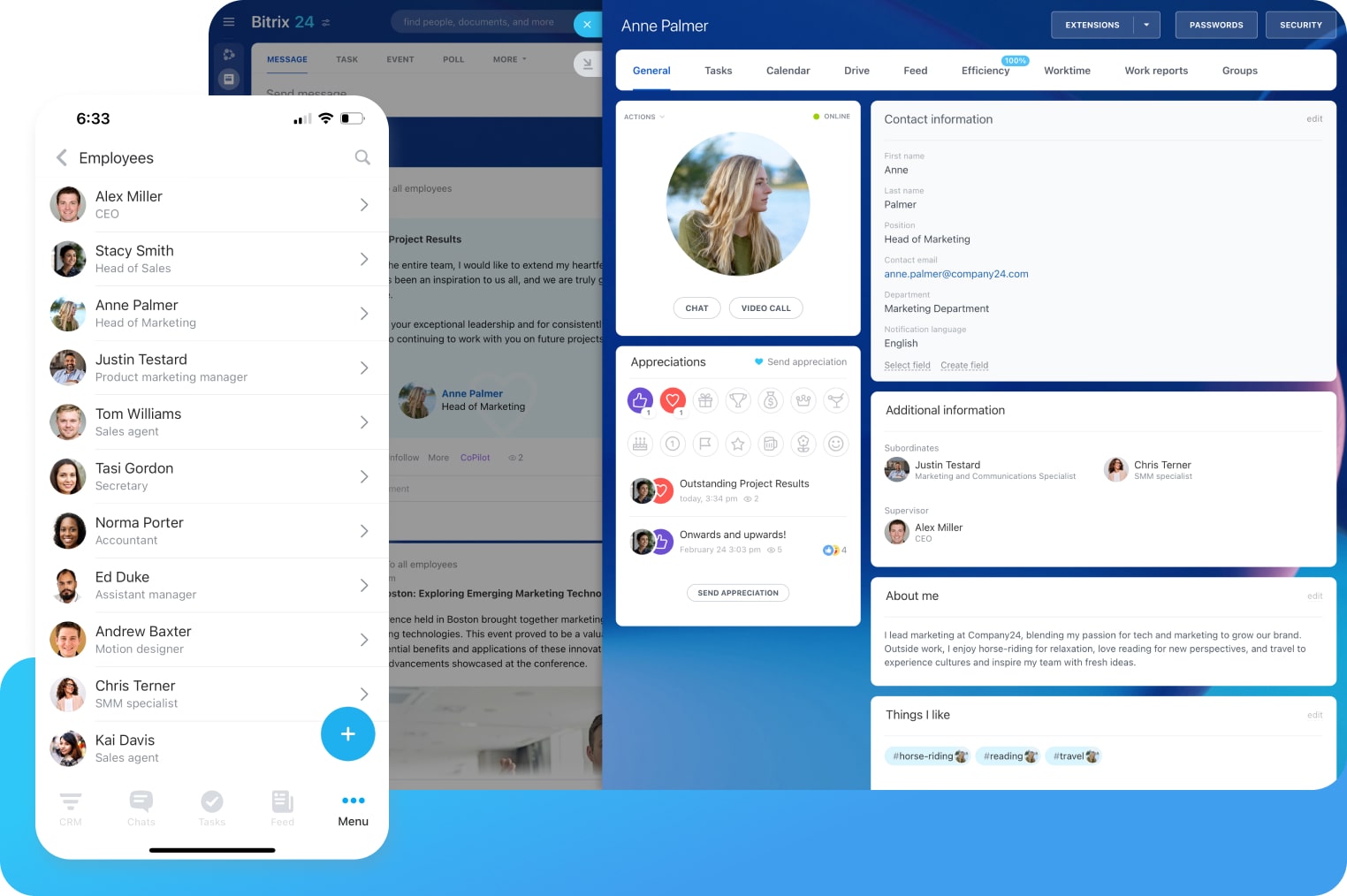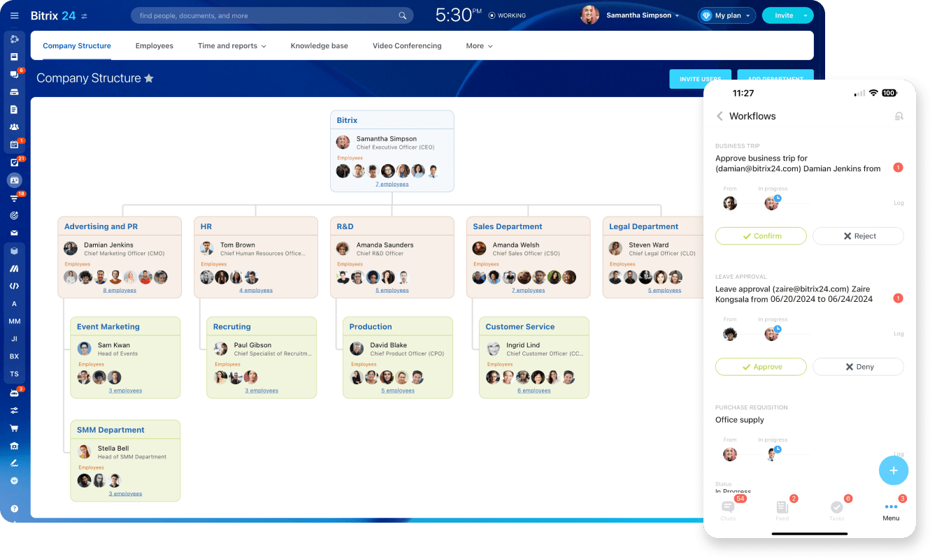 Bitrix24 puts everything you need to manage people and teams in one easy-to-use platform. From schedules and time tracking to collaboration and access permissions, you can keep everyone organized without switching between multiple apps. The result: faster decisions, fewer bottlenecks, and a smoother employee experience.