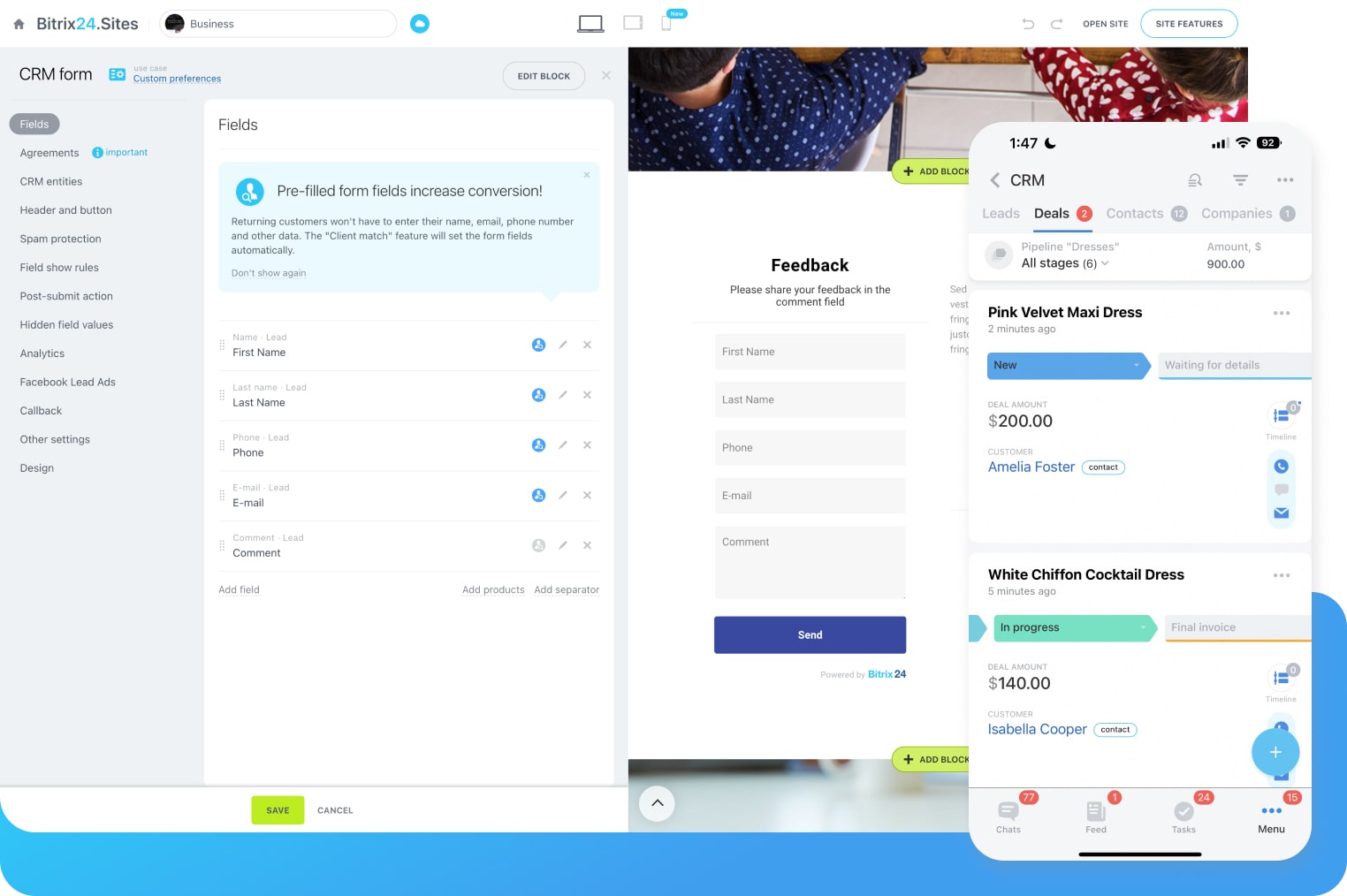 Thanks to the integration with the rest of the Bitrix24 tools, every submitted web form, incoming phone call, or live chat message on your website will automatically result in a new lead or deal added to CRM.