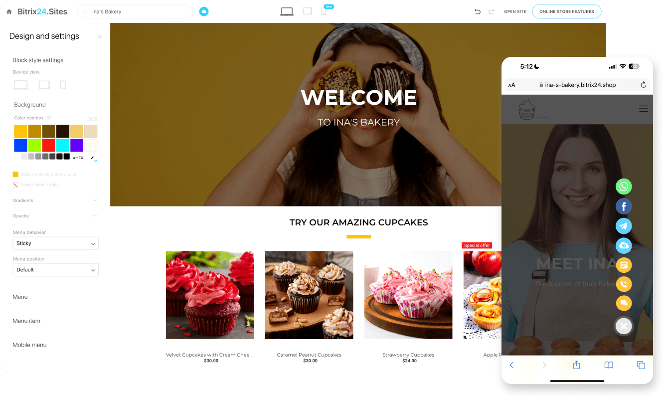 Use our intuitive, no-code website builder to create beautiful sites, landing pages, and online stores that are fully integrated with Bitrix24 CRM and online marketing tools.